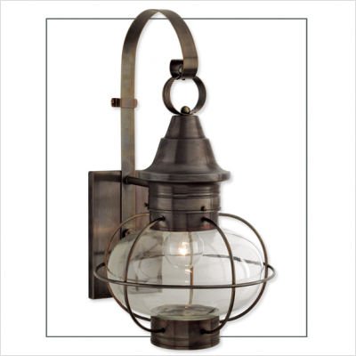 1609-GM-PR Finish: Gun Metal, Glass Type: Prismatic Pictured in sienna Features: -One light large outdoor wall mount lantern. -New Vidalia Onion collection. -Available in Antique Brass, Black, Copper, Gun Metal, Satin Brass, Sienna or Verde finish. -Brass construction. -Shade shape: Oval. -Traditional and classic style. -Light direction: Down. -UL listed for wet location. -Made in USA. Specifications: -Accommodates (1) 100W incandescent Edison base bulb. -Overall dimensions: 24.75'' H x 14'' W.