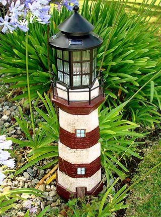 This elegant solar lighthouse garden lights is an excellent addition to any outdoor space in need of a classy touch. Features: - Approx. Size: 12.5" L x 12.5" W x 39" H, 9" Diameter - Color: Red and White with Amber Light - Super-Bright LED Lights, with Lifetime of Over 100,000 Hours - Solar Powered Panel with 2 Rechargeable Ni-Cd Batteries Included - Sensor Automatically Turns Lights on when it's Dark and Off when it's Light - Single Charge Provides 8-10 Hours of Light (Requires Initial 8-Hour Charge in On Position) - High-Quality and Safe Lighting- No Fire or Electric Shock Hazard - Water-Resistant, Corrosion-Resistant - No Wires Needed