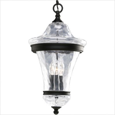 P5551-31 Features: -Three-light hanging lantern. -Seirenes Outdoor Collection. -Textured black finish. -Water patterned blown glass. -Decorative band and finial. -Aluminum construction. -Chain hung from a ceiling canopy. -Phenolic candelabra based sockets. -UL-CUL damp location listed. -Companion fixtures: post top and wall mounted lanterns. Specifications: -Bulb accommodates: 3 x 60W medium base - incandescent. -Overall length: 96''. -Wire length: 180''. -Dimensions: 20.5'' H x 11.13'' W. For more information on this product, please view the specification sheet(s) below: Specifications