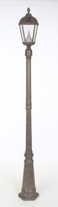 Go Green with our Royal Solar Lamp Posts. This 7 high solar powered lamp will add a distinctive look to the front or back of your home. Using our patented cone reflector technology, this solar lamp and post, with super bright white LEDs, will safely light your entry, elegantly enhance your home, and impress your neighbors. The powder-coated cast-aluminum solar lamp posts are weather and rust resistant requiring no maintenance and the solar lantern turns on at dusk and off at dawn automatically. 8 to 10 hours of light per night Automatically turns on at dusk and off dawn Manual Hi/Lo light brightness switch 5 Pcs Super Bright 10 MM LEDs with patented prism New 3.2V/1500Ma Li-Ion rechargeable batteries included Beautiful beveled glass Patented cone reflector technology creates brightest light Post has a durable, rust-resistant cast aluminum frame Weathered Bronze finish Dimensions: 85"H 1 Year manufacturer warranty